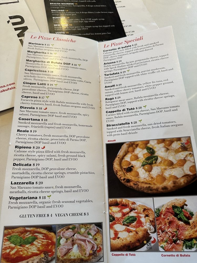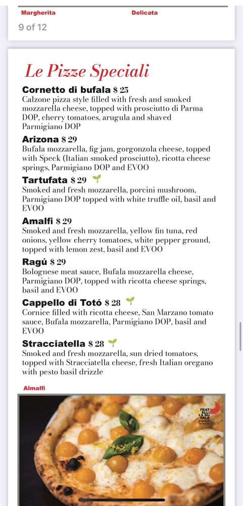 Introducing the menu at Fratelli La Bufala - Scottsdale, an Italian pizza restaurant located in Scottsdale, AZ. This spot offers a range of traditional Italian dishes, including Polpette Al Sugo, Scugnizzielli, and Parmigiana in Carrozza for starters, and salads like Mista, Cesare, and Spinaci. Customer reviews rave about the Margarita Pizza and the lasagna, highlighting the authentic Italian flavors and quality ingredients. The thin-crust Neapolitan pizzas are a standout, with many guests praising the light, crispy texture and flavorful toppings. The cozy ambiance, friendly service, and imported Italian beers add to the dining experience. Overall, Fratelli La Bufala - Scottsdale is a must-visit for those craving delicious Italian cuisine in a welcoming atmosphere.